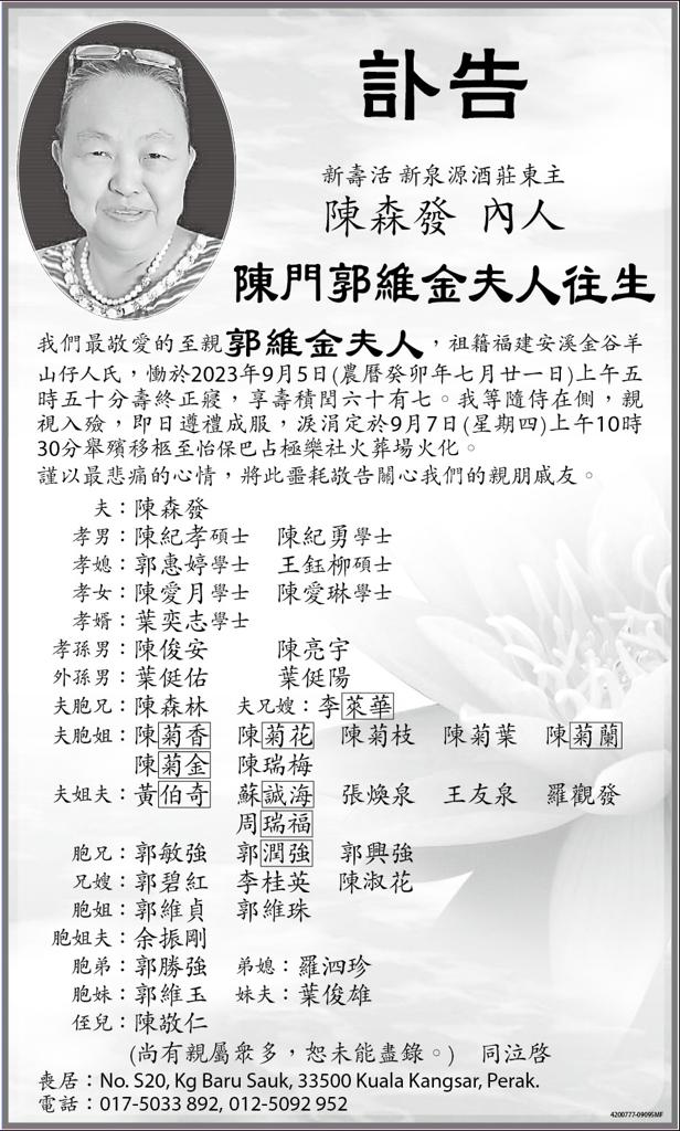 您事事为我们着想,是个伟大的妈妈。我爱您。到现在我都还没能完全接受您的离去,我们明明几天前才相聚,还到怡保吃火锅。但是我们得面对现实,我们肯定是会想念您的。